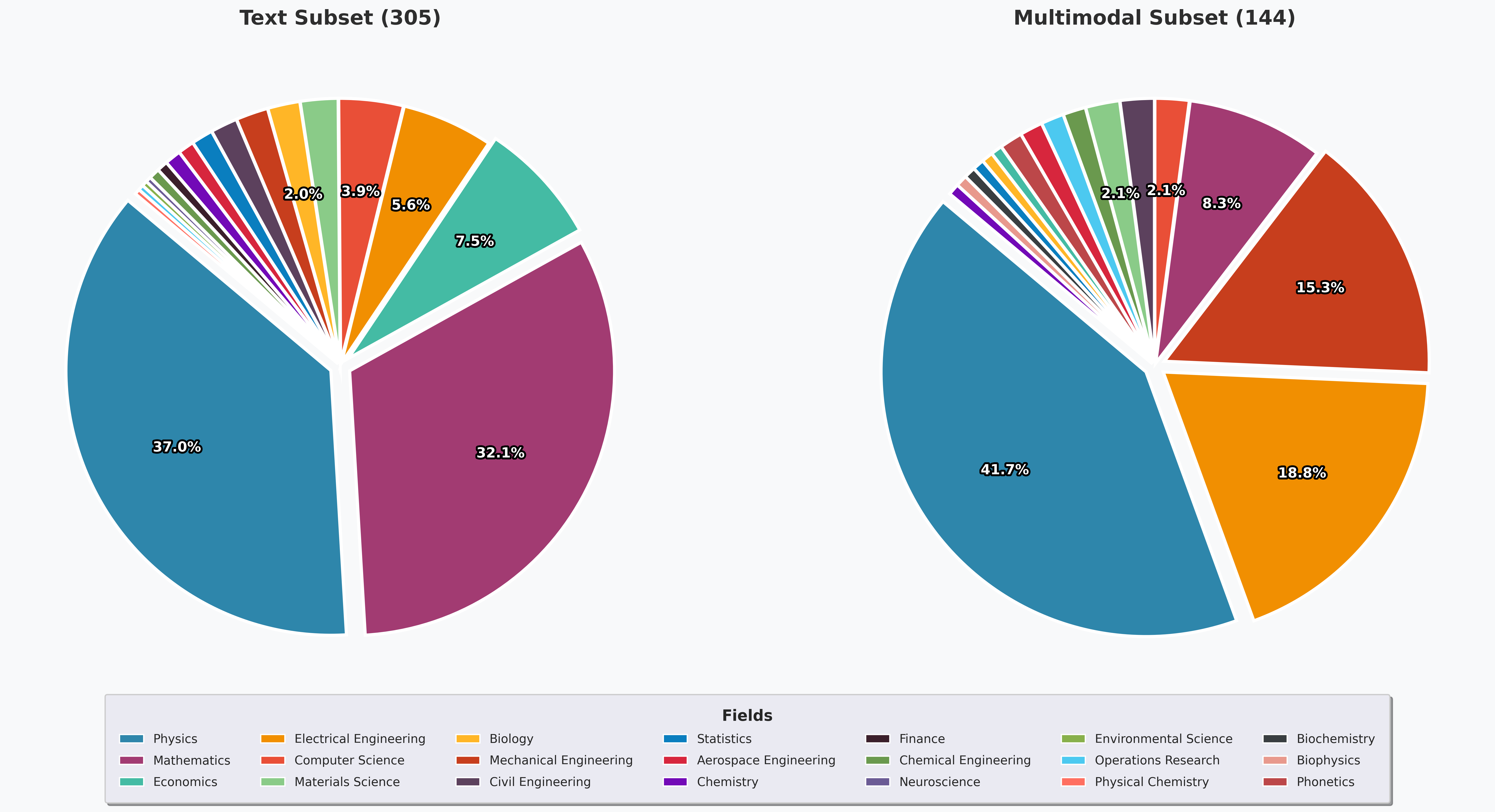 CFE-Bench is a cross-disciplinary STEM reasoning benchmark consisting of a text-only split (305 questions) and a multimodal split (144 questions). The text-only subset primarily covers Physics and Mathematics, with additional problems in Economics, Electrical Engineering, and Computer Science. The multimodal subset emphasizes Physics and multiple engineering domains, including Electrical and Mechanical Engineering, alongside a diverse tail of other STEM fields.