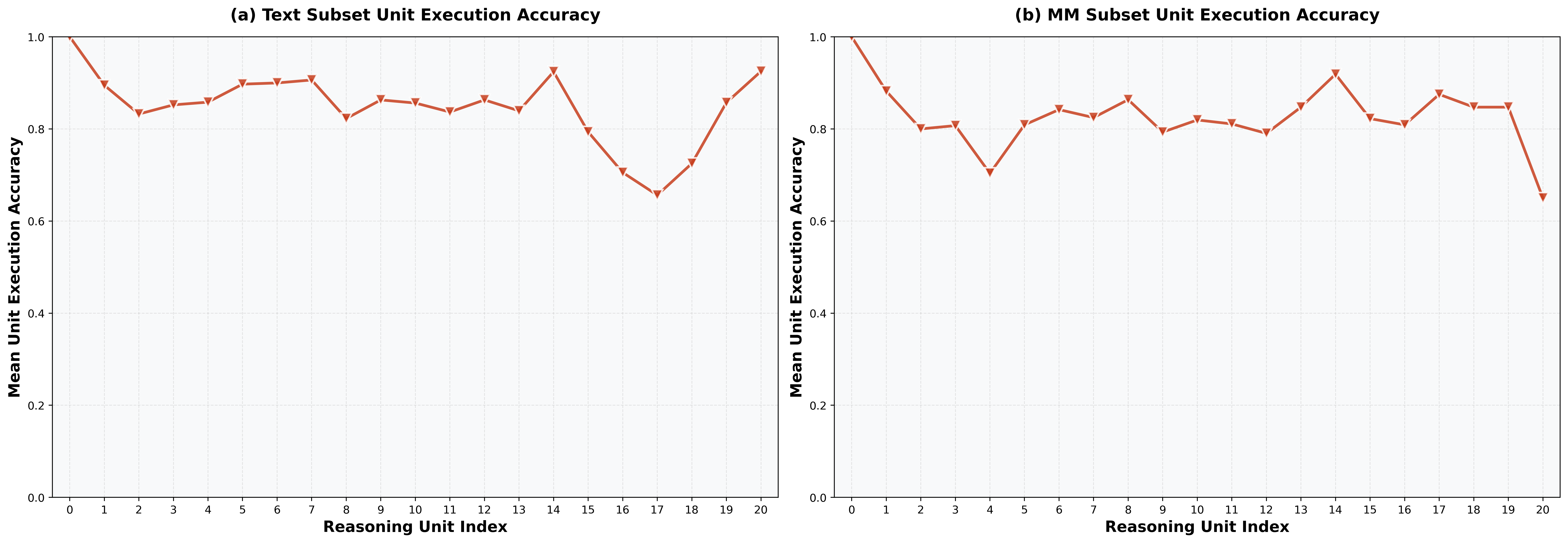 Findings. Unit Execution diagnostics figures show that unit execution accuracy is consistently high, typically ~0.8-0.9 in the text subset, with a similar pattern and modest dips in the multimodal subset. This indicates that many end-to-end failures are not explained by an inability to execute individual steps once the correct sub-question is specified.