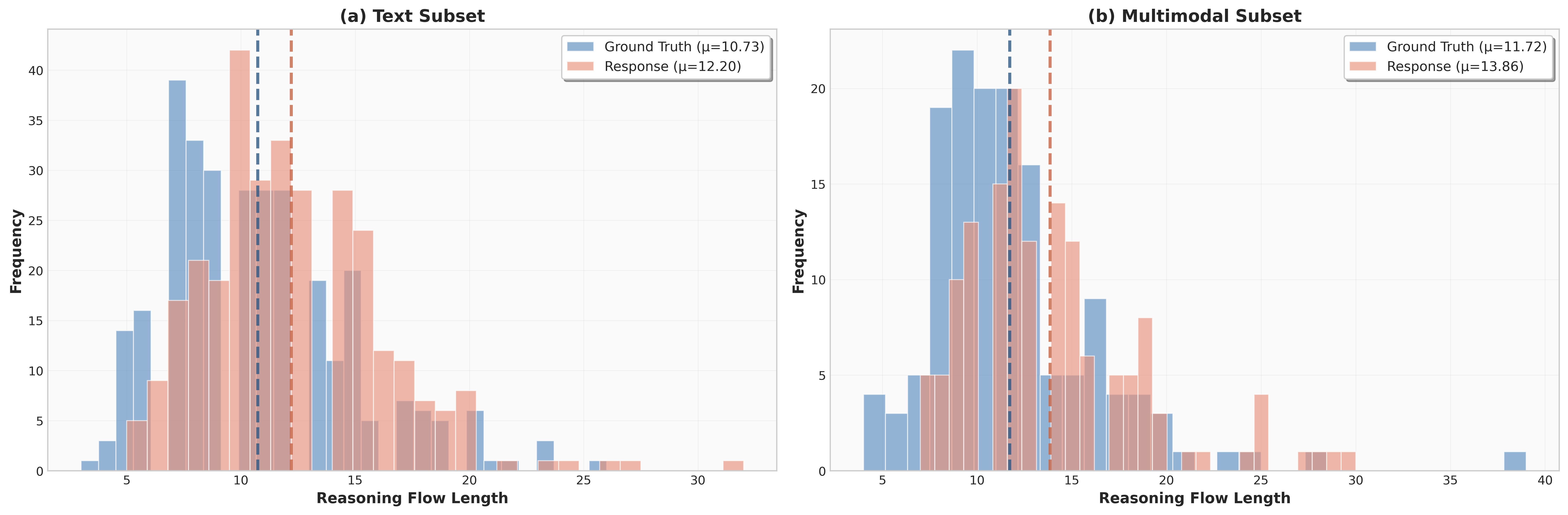 Beyond end-to-end accuracy, we analyze how efficiently strong models solve CFE questions. We compare the distribution of reasoning-flow lengths between human-verified ground truth and model-generated solutions. Across both subsets, model responses are on average longer than the ground truth, indicating lower step efficiency. For the text subset, the mean response length is 12.20 versus a ground-truth mean of 10.73 (~14% longer); for the multimodal subset, the gap is larger: 13.86 versus 11.72 (~18% longer). This length inflation indicates that current models do not reliably allocate reasoning steps to efficient intermediate quantities.