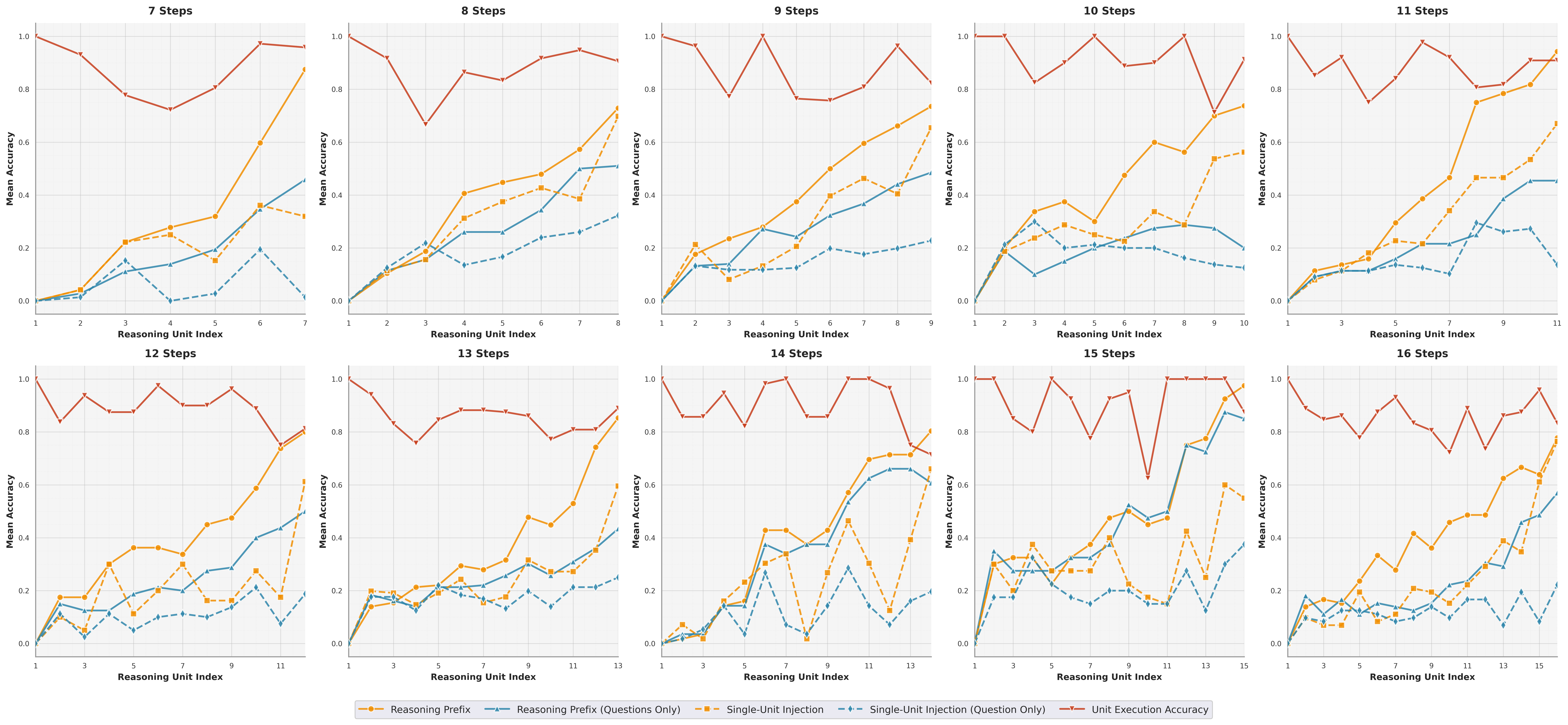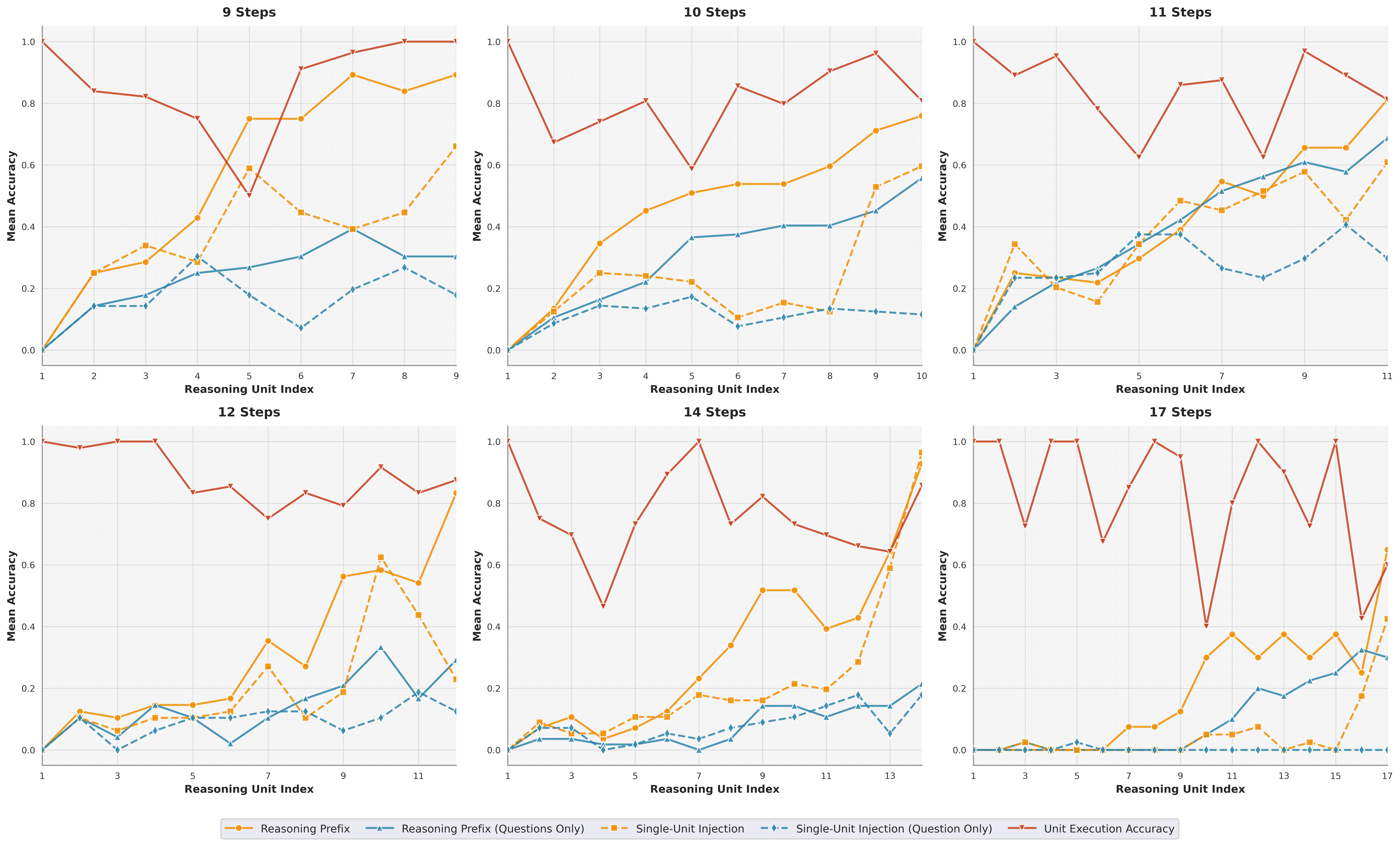 Findings. Across both subsets, Single-Unit Injection yields meaningful gains over the Questions Only variants, while Single-Unit Injection (Question Only) remains low across all diagnostics. This confirms that the missing information is often the unit answer, not merely the decomposition structure. Notably, injecting a single unit with its answer can be nearly as effective as providing a full reasoning prefix without answers, despite conditioning on substantially less context. This indicates that once a correct intermediate value is supplied, the model can proceed with downstream deductions almost as effectively as if guided by many preceding sub-questions. The limiting factor is not knowing what intermediate questions to ask, but reliably deriving the right intermediate answers and carrying them forward without drift.